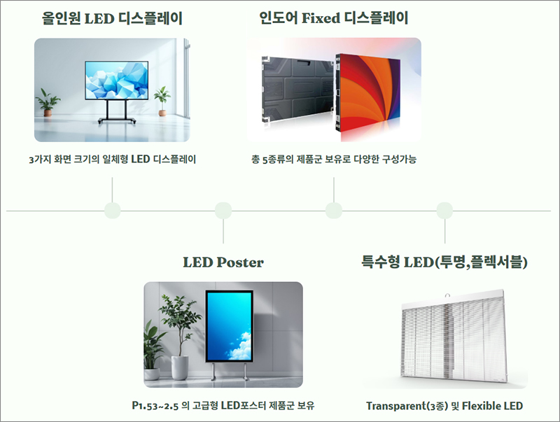 다양한 화잘과 크기 조절로 목적과 예산에 맞게 설계가 가능합니다. 실내외 대형 디스플레이부터 LED 현수막 등 다양한 형태로 맞춤 제작할 수 있습니다.